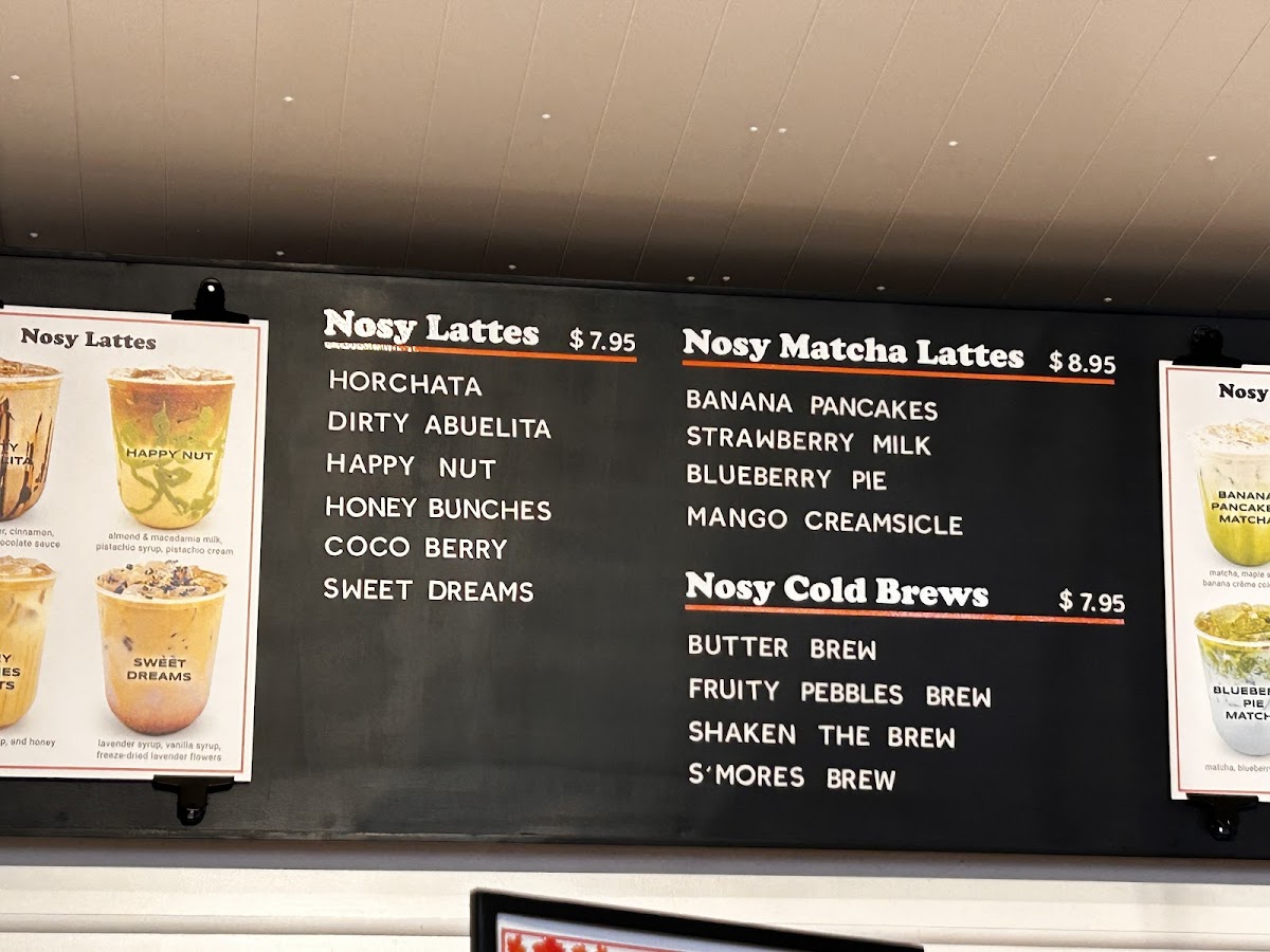The menu at Nosy Neighbors Coffee & Donuts offers a variety of coffee beverages, light breakfast options, and sweet treats suitable for different times of the day. It is designed for casual dining and quick orders, making it convenient for visitors seeking a coffee break or a light meal.